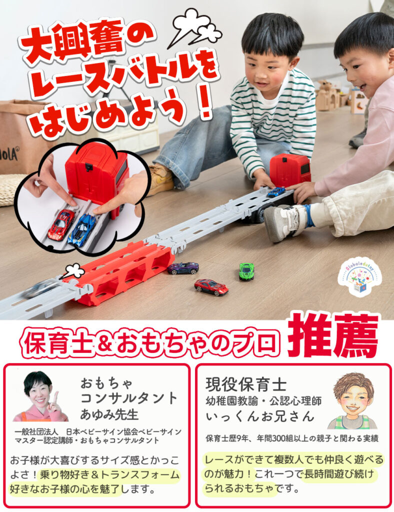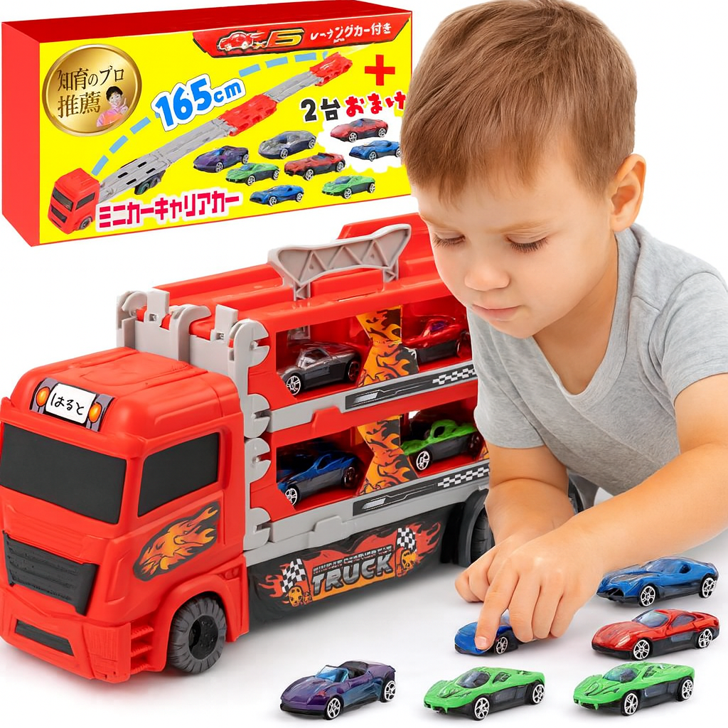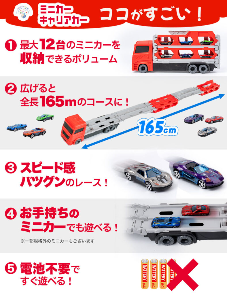 【おもちゃコンサルタント推薦】折りたたみ式のキャリアカーにはすべてのミニカーを簡単に収容できて、それ自体が大きなおもちゃとして遊べます。荷台部分を広げれば全長165cmのロングコースに変身。友達や家族とレースバトルを楽しめます。