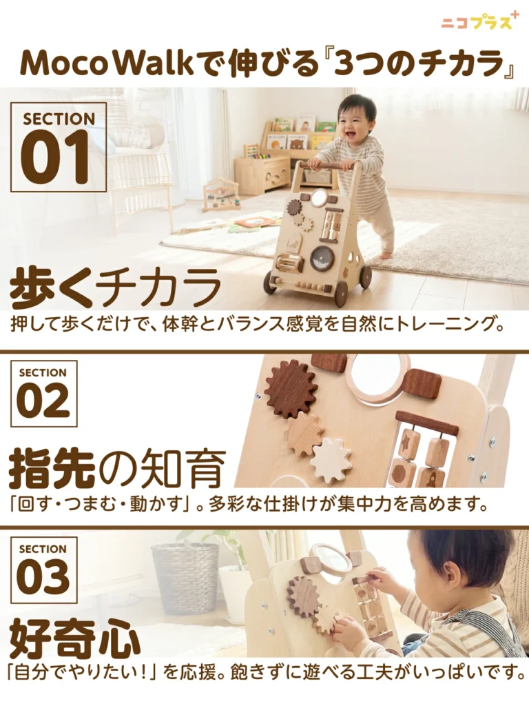 【Moco Walkとは】 北欧風のやさしい木のぬくもりを感じながら、赤ちゃんの“はじめての一歩”をしっかり支えるベビー用手押し車「Moco Walk(モコウォーク)」。