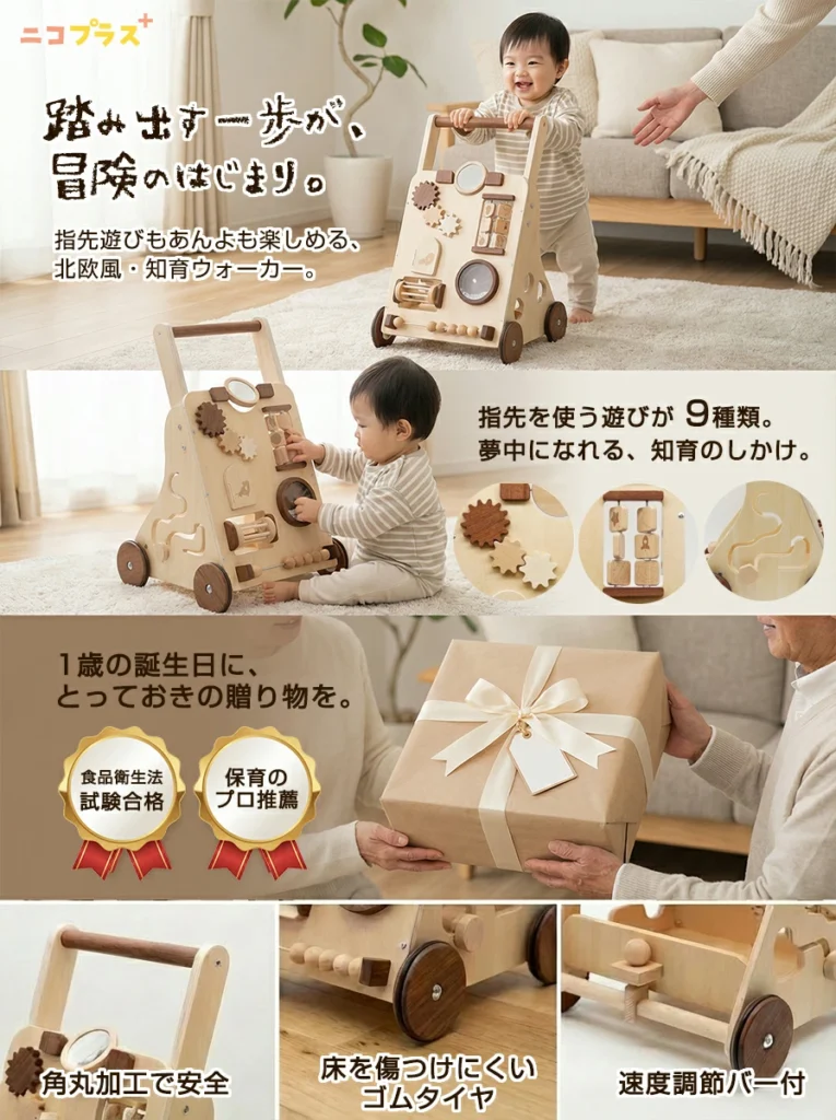12か月頃から使える歩行サポートアイテムとして、歩けるようになりたい時期の好奇心と挑戦心を自然に引き出します。温かみのあるデザインで、お部屋のインテリアに馴染むのも魅力。
