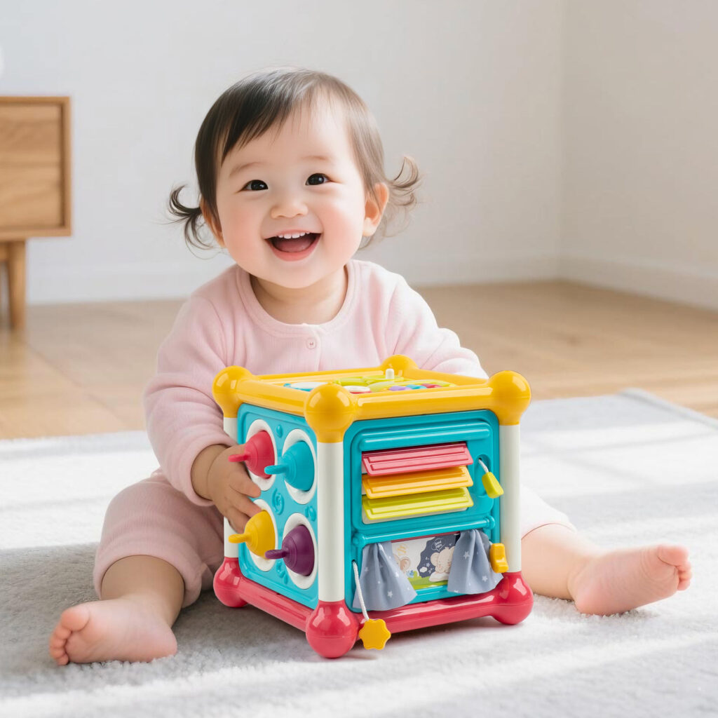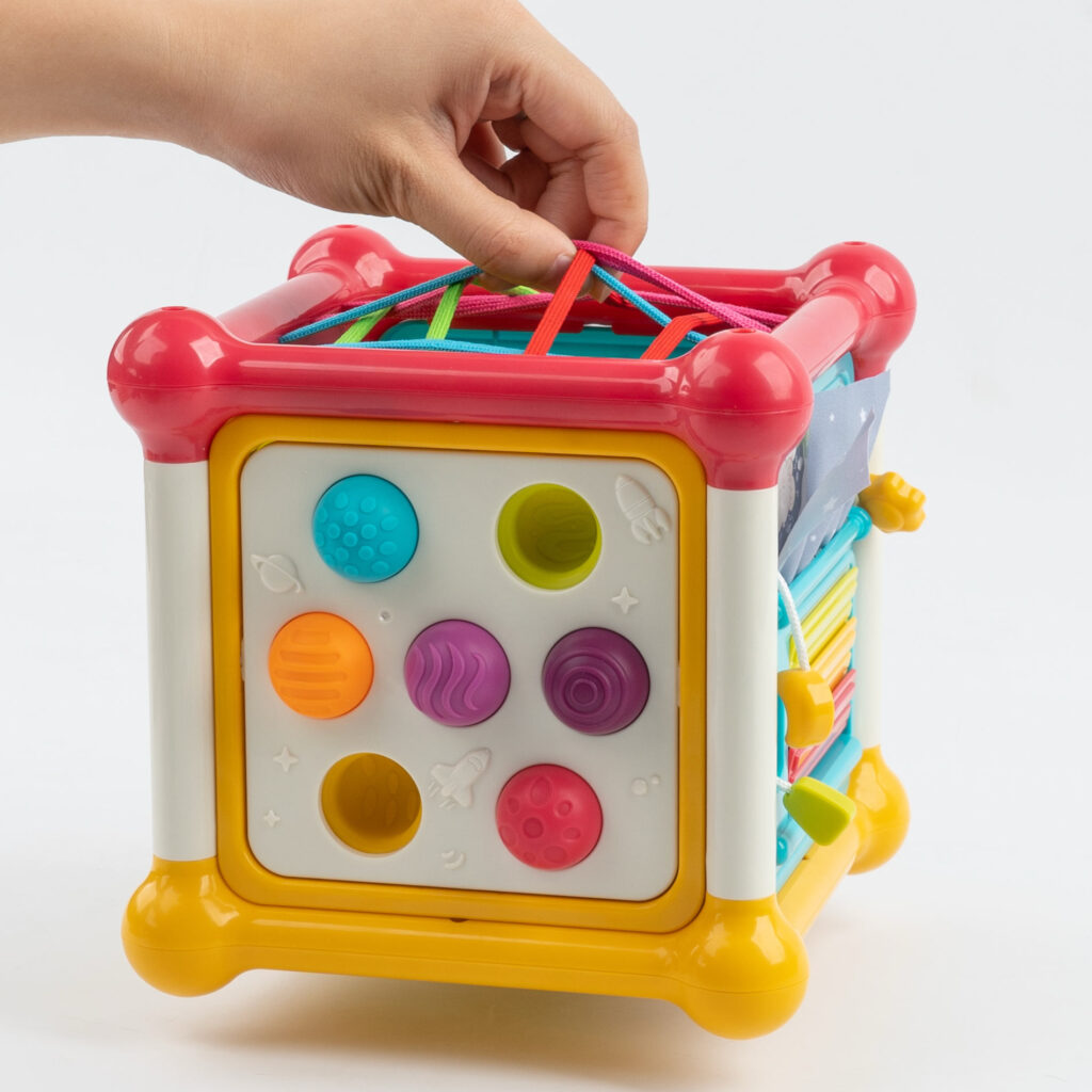 楽器・歯車・ひも通し・ブロック・飛び出す仕掛け、引っ張り遊びなど、赤ちゃんの好奇心を次々に刺激して、長い時間遊ぶことができます。